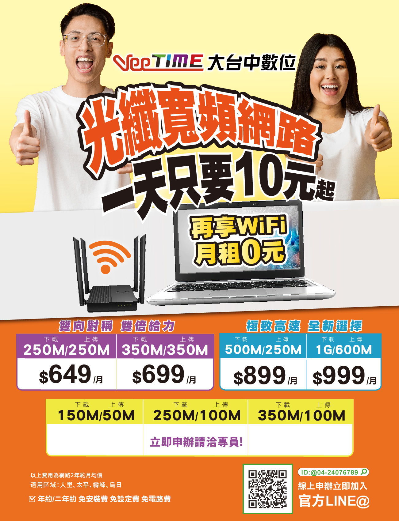 1.本方案限新申裝/到期續約,如同一地址一拆一裝,恕無法使用新方案。2.新申辦無約方案需收安裝設定費1,500元,年約(含)以上方案優惠免收安裝設定費1,500元。【新用戶】違約金計算方式:3.年約方案提前終止或解除,須依未到期的使用天數比例支付違約金2,400元+優惠的安裝設定費1,500元。計算方式為[(違約金+安裝設定費)*(合約未使用天數/365天)],其餘溢繳費用退還。4.二年約方案提前終止或解除,須依未到期的使用天數比例支付違約金3,000元+優惠的安裝設定費1,500元。計算方式為[(違約金+安裝設定費)*(合約未使用天數/730天)],其餘溢繳費用退還。【既有用戶、續約戶】違約金計算方式:5.年約方案提前終止或解除,須依未到期的使用天數比例支付違約金2,400元。計算方式為[(違約金)*(合約未使用天數/365天)],其餘溢繳費用退還。6.二年約方案提前終止或解除,須依未到期的使用天數比例支付違約金3,000元。計算方式為[(違約金)*(合約未使用天數/730天)],其餘溢繳費用退還。7.【WiFi月租0元】方案將提供指定WiFi分享器壹台,並於安裝時加註於設備保管同意書中,如有遺失或損毀,將需按照定價金額賠償。7-1如客戶堅持使用自己的WiFi,不願意接受WiFi安裝,在無其他設備需要加註於設備保管同意書中,工程師請將WiFi帶回,WiFi派工單取消,達成完工。7-2如客戶之後提出WiFi分享器的需求,請依原有流程派工,並收取安裝費500元,並於安裝後簽署設備保管同意書。8.【數位超值頻道】將提供指定機上盒壹台,並於安裝時加註於設備保管同意書中,如有遺失或損毀,將需按照定價金額賠償。8-1如客戶堅持不願意接受機上盒安裝,在無其他設備需要加註於設備保管同意書中,工程師請將機上盒帶回,機上盒派工單取消,達成完工。8-2如客戶之後提出機上盒的安裝需求,請依原有流程派工,並收取安裝費500元,並於安裝後簽署設備保管同意書。9.【全區網路方案】繳別:季繳、半年繳、年繳、2年繳。合約為期【12/24】個月;合約結束後第1個月起,本合約各項服務使用費,按當期公告牌價,按月計價。10.光纖寬頻上網服務,若作為營業或供營業場所使用視為違約,本合約自違約事實發生日起,當然終止。如有營業需求,請洽客服專線由專人為您服務。11.本方案不得與本公司其他優惠或促銷方案併用。12.本公司網路服務,因受距離及設備限制,供租對象為本公司目前已佈建完成之地點為限,請洽客服查詢是否可供裝。13.大台中數位保有更換優惠活動及解釋、變更、終止方案內容之權利。14.方案期間至114年12月31日止。如有任何問題,敬請洽詢門市或客服中心。