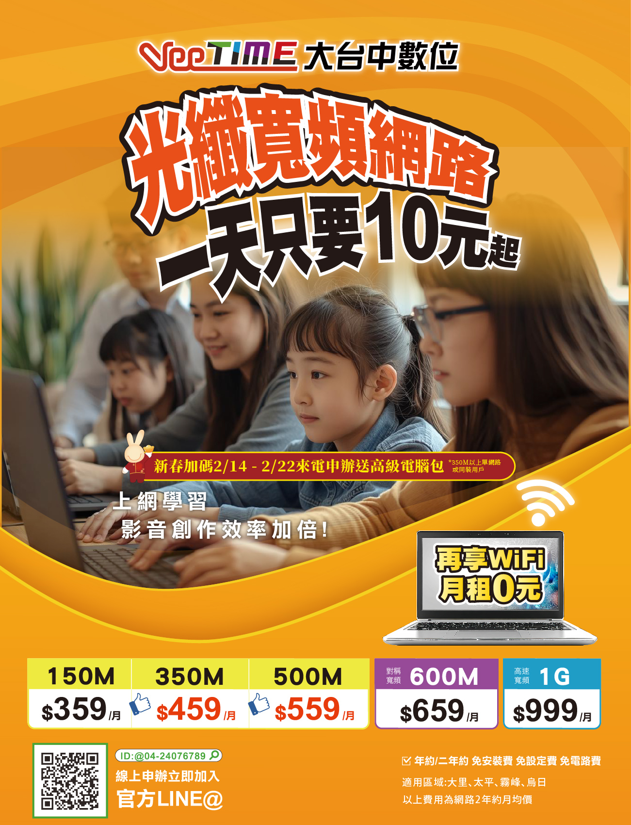 1.本方案限新申裝/到期續約,如同一地址一拆一裝,恕無法使用新方案。2.新申辦無約方案需收安裝設定費1,500元,年約(含)以上方案優惠免收安裝設定費1,500元。【新用戶】違約金計算方式:3.年約方案提前終止或解除,須依未到期的使用天數比例支付違約金2,400元+優惠的安裝設定費1,500元。計算方式為[(違約金+安裝設定費)*(合約未使用天數/365天)],其餘溢繳費用退還。4.二年約方案提前終止或解除,須依未到期的使用天數比例支付違約金3,000元+優惠的安裝設定費1,500元。計算方式為[(違約金+安裝設定費)*(合約未使用天數/730天)],其餘溢繳費用退還。【既有用戶、續約戶】違約金計算方式:5.年約方案提前終止或解除,須依未到期的使用天數比例支付違約金2,400元。計算方式為[(違約金)*(合約未使用天數/365天)],其餘溢繳費用退還。6.二年約方案提前終止或解除,須依未到期的使用天數比例支付違約金3,000元。計算方式為[(違約金)*(合約未使用天數/730天)],其餘溢繳費用退還。7.【WiFi月租0元】方案將提供指定WiFi分享器壹台,並於安裝時加註於設備保管同意書中,如有遺失或損毀,將需按照定價金額賠償。7-1如客戶堅持使用自己的WiFi,不願意接受WiFi安裝,在無其他設備需要加註於設備保管同意書中,工程師請將WiFi帶回,WiFi派工單取消,達成完工。7-2如客戶之後提出WiFi分享器的需求,請依原有流程派工,並收取安裝費500元,並於安裝後簽署設備保管同意書。8.【數位超值頻道】將提供指定機上盒壹台,並於安裝時加註於設備保管同意書中,如有遺失或損毀,將需按照定價金額賠償。8-1如客戶堅持不願意接受機上盒安裝,在無其他設備需要加註於設備保管同意書中,工程師請將機上盒帶回,機上盒派工單取消,達成完工。8-2如客戶之後提出機上盒的安裝需求,請依原有流程派工,並收取安裝費500元,並於安裝後簽署設備保管同意書。9.【全區網路方案】繳別:季繳、半年繳、年繳、2年繳。合約為期【12 / 24】個月;合約結束後第1個月起,本合約各項服務使用費,按當期公告牌價,按月計價。10.光纖寬頻上網服務,若作為營業或供營業場所使用視為違約,本合約自違約事實發生日起,當然終止。如有營業需求,請洽客服專線由專人為您服務。11.本方案不得與本公司其他優惠或促銷方案併用。12.本公司網路服務,因受距離及設備限制,供租對象為本公司目前已佈建完成之地點為限,請洽客服查詢是否可供裝。13.大台中數位保有更換優惠活動及解釋、變更、終止方案內容之權利。14.方案期間至115年03月31日止。如有任何問題,敬請洽詢門市或客服中心。
