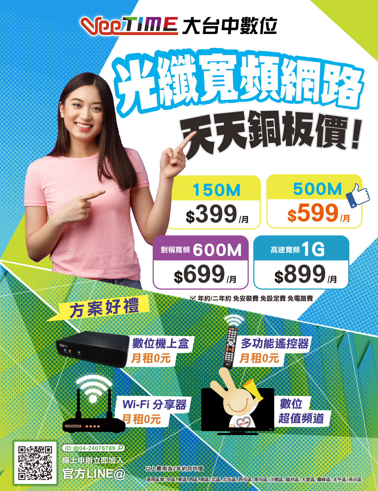 1.本方案限新申裝/到期續約,如同一地址一拆一裝,恕無法使用新方案。2.新申辦無約方案需收安裝設定費1,500元,年約(含)以上方案優惠免收安裝設定費1,500元。【新用戶】違約金計算方式:3.年約方案提前終止或解除,須依未到期的使用天數比例支付違約金2,400元+優惠的安裝設定費1,500元。計算方式為[(違約金+安裝設定費)*(合約未使用天數/365天)],其餘溢繳費用退還。4.二年約方案提前終止或解除,須依未到期的使用天數比例支付違約金3,000元+優惠的安裝設定費1,500元。計算方式為[(違約金+安裝設定費)*(合約未使用天數/730天)],其餘溢繳費用退還。【既有用戶、續約戶】違約金計算方式:5.年約方案提前終止或解除,須依未到期的使用天數比例支付違約金2,400元。計算方式為[(違約金)*(合約未使用天數/365天)],其餘溢繳費用退還。6.二年約方案提前終止或解除,須依未到期的使用天數比例支付違約金3,000元。計算方式為[(違約金)*(合約未使用天數/730天)],其餘溢繳費用退還。7.【WiFi月租0元】方案將提供指定WiFi分享器壹台,並於安裝時加註於設備保管同意書中,如有遺失或損毀,將需按照定價金額賠償。7-1如客戶堅持使用自己的WiFi,不願意接受WiFi安裝,在無其他設備需要加註於設備保管同意書中,工程師請將WiFi帶回,WiFi派工單取消,達成完工。7-2如客戶之後提出WiFi分享器的需求,請依原有流程派工,並收取安裝費500元,並於安裝後簽署設備保管同意書。8. 【數位超值頻道】將提供指定機上盒壹台,並於安裝時加註於設備保管同意書中,如有遺失或損毀,將需按照定價金額賠償。8-1如客戶堅持不願意接受機上盒安裝,在無其他設備需要加註於設備保管同意書中,工程師請將機上盒帶回,機上盒派工單取消,達成完工。8-2如客戶之後提出機上盒的安裝需求,請依原有流程派工,並收取安裝費500元,並於安裝後簽署設備保管同意書。9.【全區網路方案】繳別:季繳、半年繳、年繳、2年繳。合約為期【12/24】個月;合約結束後第1個月起,本合約各項服務使用費,按當期公告牌價,按月計價。10.光纖寬頻上網服務,若作為營業或供營業場所使用視為違約,本合約自違約事實發生日起,當然終止。如有營業需求,請洽客服專線由專人為您服務。11.本方案不得與本公司其他優惠或促銷方案併用。12.本公司網路服務,因受距離及設備限制,供租對象為本公司目前已佈建完成之地點為限,請洽客服查詢是否可供裝。13.大台中數位保有更換優惠活動及解釋、變更、終止方案內容之權利。14.方案期間至115年06月30日止。如有任何問題,敬請洽詢門市或客服中心。